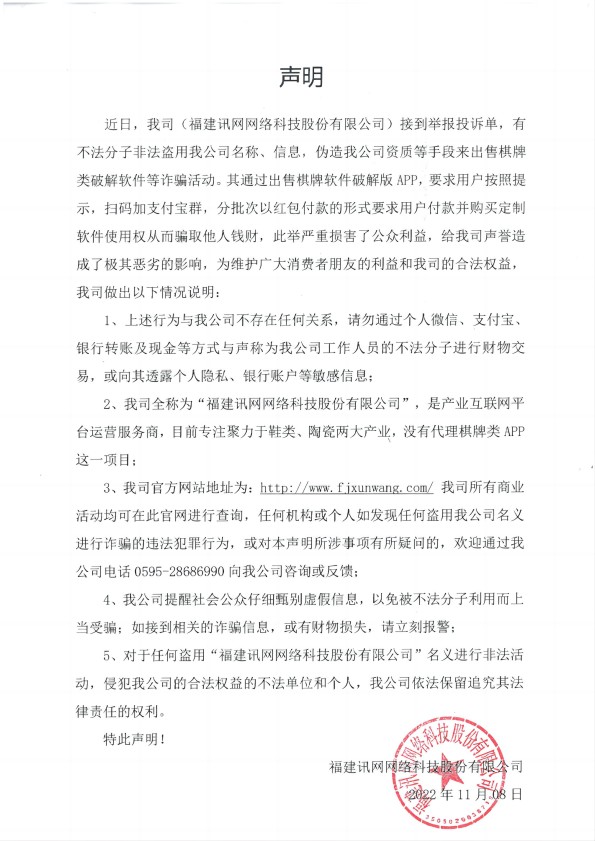 近日,我司(福建訊網(wǎng)網(wǎng)絡(luò)科技股份有限公司)接到舉報投訴單,有不法分子非法盜用我公司名稱、信息,偽造我公司資質(zhì)等手段來出售棋牌類破解軟件等詐騙活動。其通過出售棋牌軟件破解版APP,要求用戶按照提示,掃碼加支付寶群,分批次以紅包付款的形式要求用戶付款并購買定制軟件使用權(quán)從而騙取他人錢財,此舉嚴(yán)重?fù)p害了公眾利益,給我司聲譽(yù)造成了極其惡劣的影響,為維護(hù)廣大消費(fèi)者朋友的利益和我司的合法權(quán)益,我司做出以下情況說明: