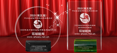 4月24日,中小企業(yè)電子商務(wù)應(yīng)用發(fā)展大會暨2009年度中國行業(yè)電子商務(wù)網(wǎng)站TOP100頒獎盛典在深圳召開。本次會議以轉(zhuǎn)型與升級為主題,會議邀請了深圳市相關(guān)政府領(lǐng)導(dǎo)、全國各優(yōu)秀電子商務(wù)企業(yè)代表、專家學(xué)者及眾多優(yōu)秀中小企業(yè)高管上千人,共同分析和探討中國中小企業(yè)電子商務(wù)應(yīng)用新發(fā)展趨勢。環(huán)球鞋網(wǎng)總經(jīng)理林文佳先生應(yīng)邀出席本次行業(yè)盛會,并在會上獲得2009年度中國行業(yè)電子商務(wù)網(wǎng)站TOP100及2009轉(zhuǎn)型與升級年度榜樣•最具商業(yè)價值獎兩項年度大獎,成為本次會議上最閃亮的明星企業(yè)之一。