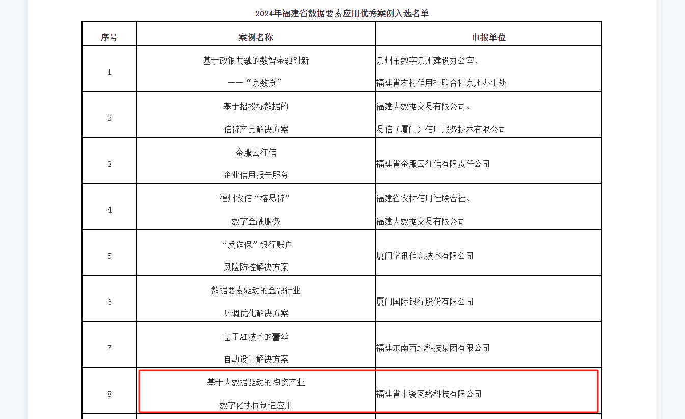 為深入貫徹《“數(shù)據(jù)要素×”三年行動計劃(2024—2026 年)》文件精神,充分發(fā)揮數(shù)據(jù)要素乘數(shù)效應,賦能經(jīng)濟社會發(fā)展,日前,福建省數(shù)據(jù)管理局發(fā)布了2024年數(shù)據(jù)要素應用優(yōu)秀案例,中瓷網(wǎng)絡“基于大數(shù)據(jù)驅(qū)動的陶瓷產(chǎn)業(yè)數(shù)字化協(xié)同制造應用”案例成功入選,泉州市唯一一家,祝賀!