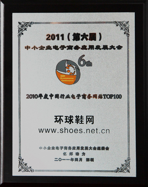 2011年4月21-23日,由億邦動力網(wǎng)、深圳市信息行業(yè)協(xié)會聯(lián)合主辦的“戴爾成就•2011(第六屆)中小企業(yè)電子商務應用發(fā)展大會暨2010年度中國行業(yè)電子商務網(wǎng)站TOP100頒獎盛典”在深圳五洲賓館隆重舉行。環(huán)球鞋網(wǎng)應邀出席典禮,并榮獲“2010年度中國行業(yè)電子商務網(wǎng)站TOP100”稱號。據(jù)悉,這是環(huán)球鞋網(wǎng)第六次榮獲“中國行業(yè)電子商務網(wǎng)站TOP100”。